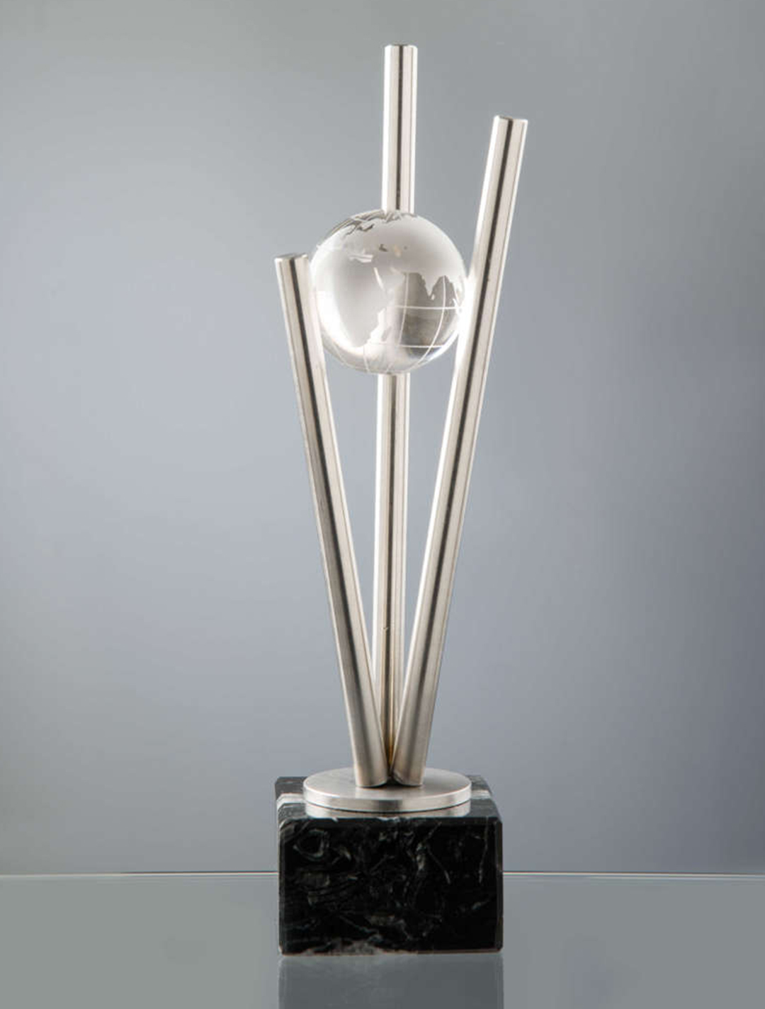 Drei massive Stäbe aus Edelstahl auf Marmorsockel F03125