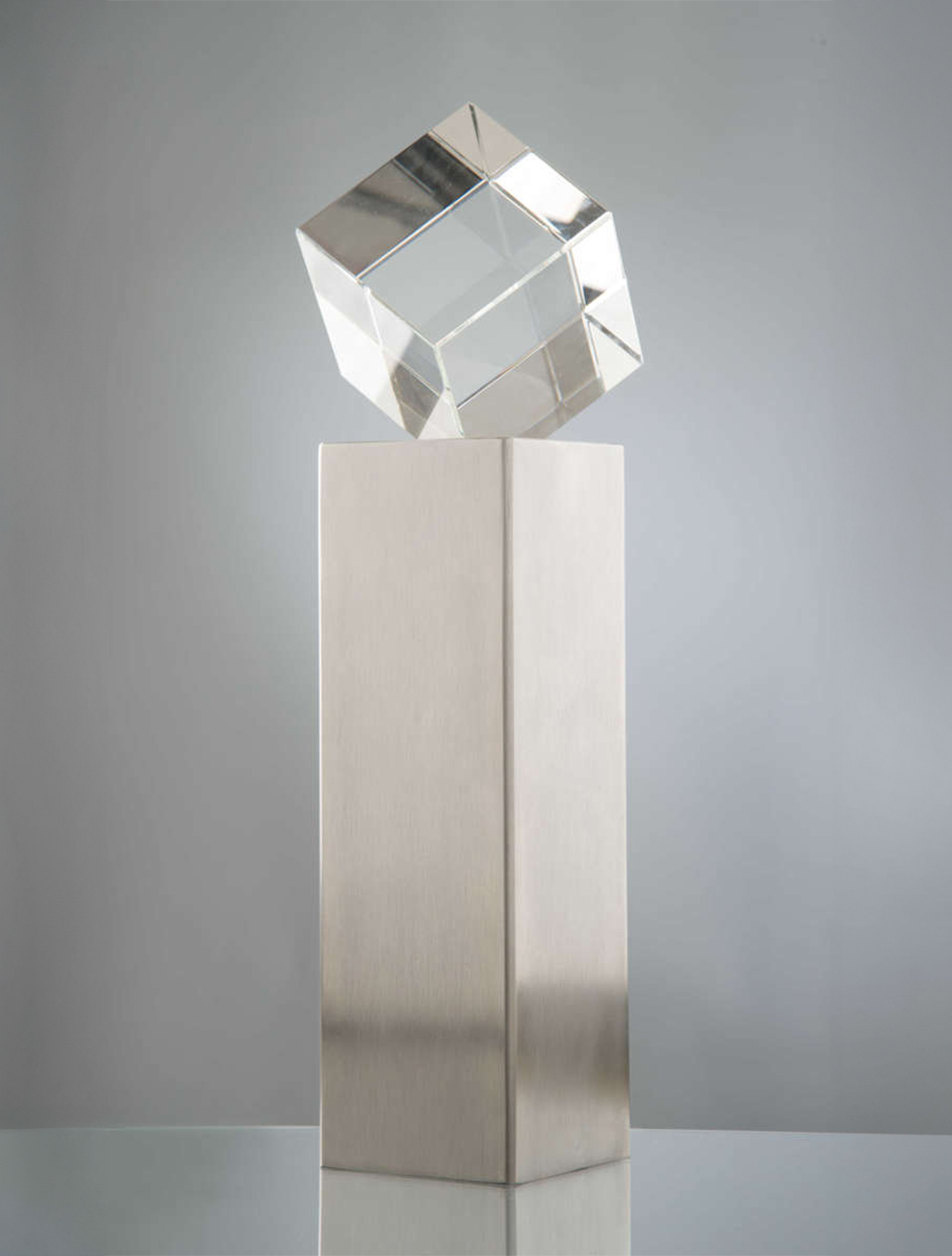 Wuchtige Edelstahlsäule mit diagonalem Würfel F03120B