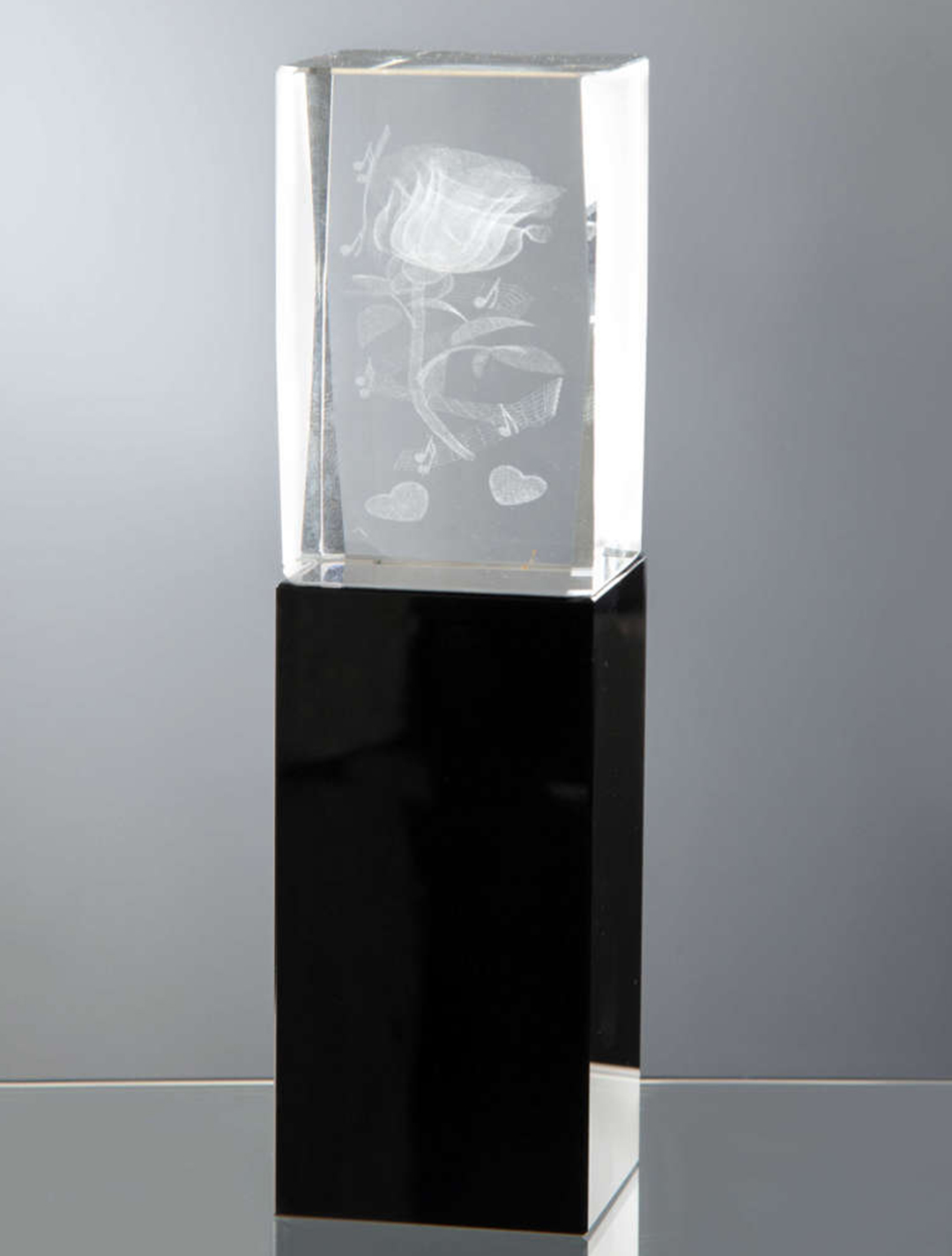 Innengelaserte Rose aufgesetzt auf massiven schwarzem Glasquader P01259