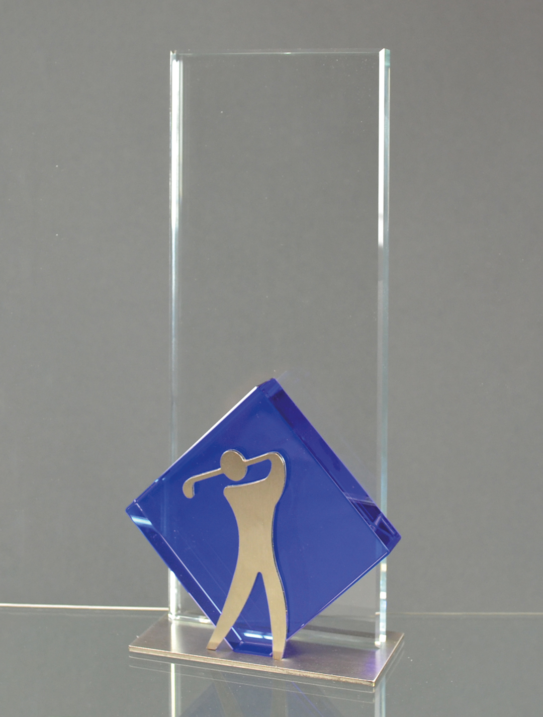 2 cm dickes Farbglas-Viereck mit Golfer, Sockel aus Edelstahl G81182