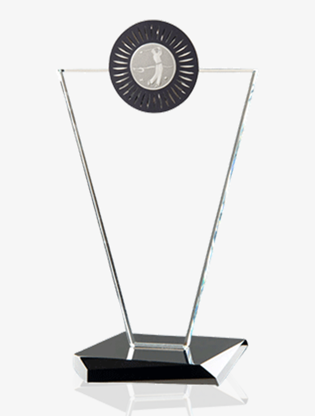 Hier ist der schwarze Massivglassockel mit schönen Schliffkanten versehen. Im schwarz/silberfarbigen Metallrondo ist das Golfemblem.