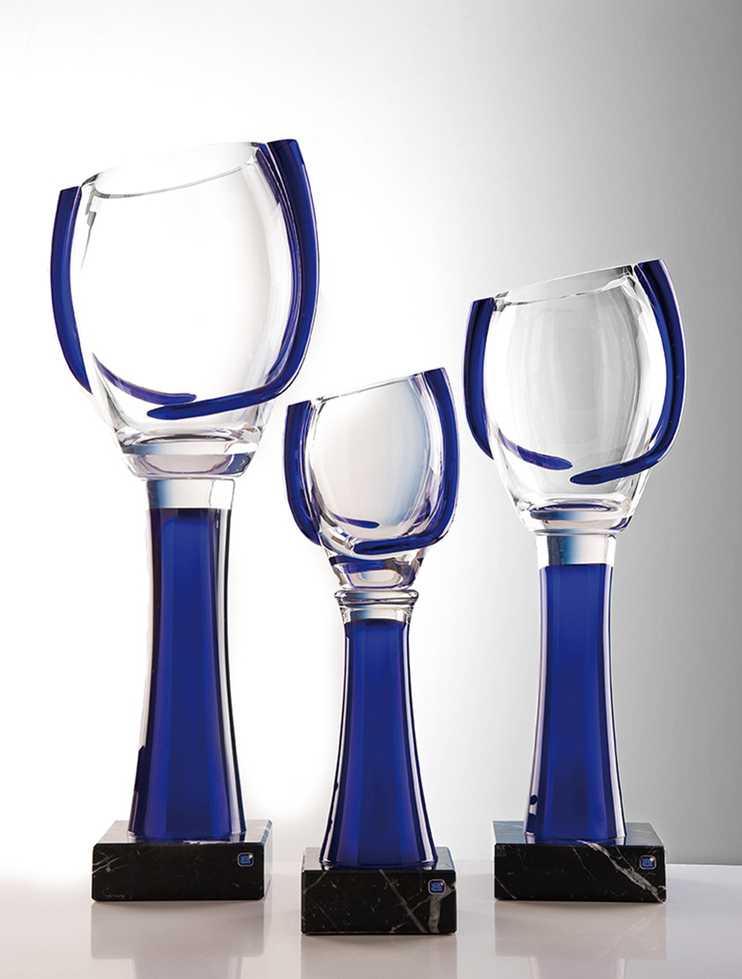 Handgezogene Stränge aus blauem Glas veredeln diese besondere Trophäe in hervorragender Glasqualität.